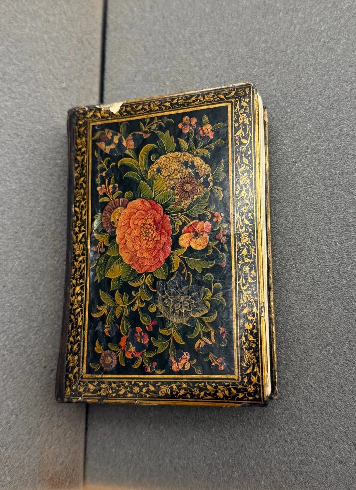 Binding: Lacquered covers with floral designs on a black ground, framed by a floral border; interior boards with brown field, black frame, and three gold-tooled inset frames; housed in a slipcase labeled "Collected poems in Persian" in gold.
