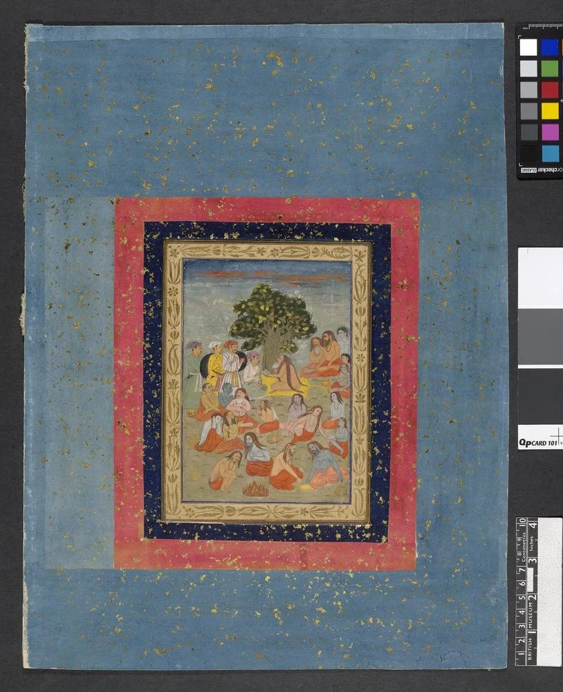 Miniature painting from a Rajasthani album (c. 1750–1800) depicting ascetics under a tree engaged in discussion around small campfires. Clad in orange robes or bare, some ascetics have blue-toned bodies smeared with ash (vibhuti), indicating their Saivite affiliation. One grey-bearded ascetic on a tiger skin hands a petition to a seated nobleman, attended by three armed attendants. Unfinished areas reveal uncoloured figures, offering insight into the painting process. Likely produced by a Mughal artist in Rajasthan, possibly Bikaner.