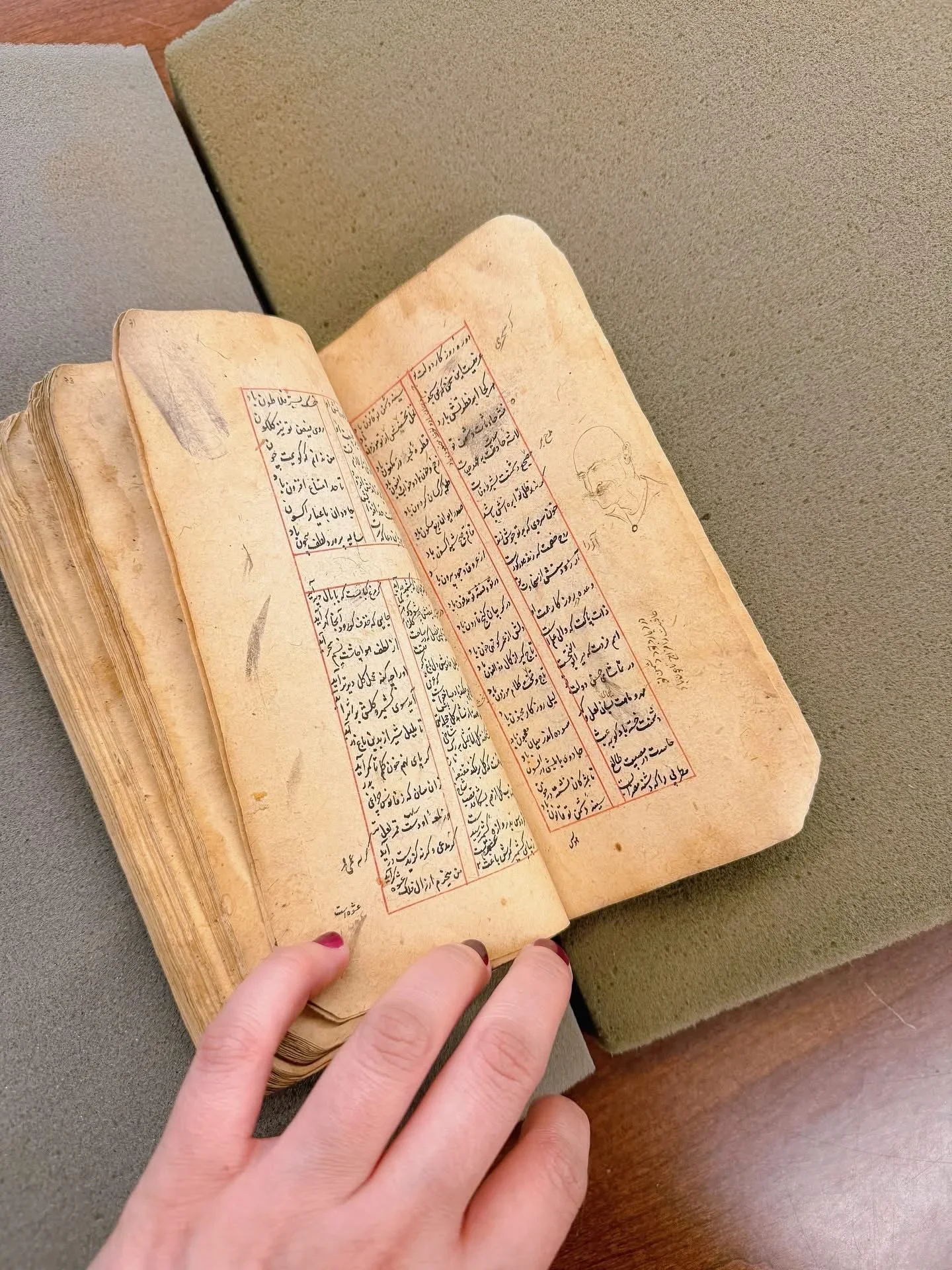 The informal marginal drawings, such as the face of a mustached man and a figure on a noose, neither of which appears to relate directly to the text, were likely added by anonymous later readers rather than the original scribe. For scholars, these seemingly unacademic additions are important because they document how the manuscript was handled, personalized, and emotionally engaged with over time, offering rare insight into the everyday human interactions that shaped the afterlife of Persian literary works beyond their original production. Such marginalia are often interpreted as evidence of reader response, moments of contemplation, boredom, or emotional reaction, and they complicate the idea of manuscripts as fixed or purely authoritative objects. When manuscripts enter libraries or museum collections, these marks become part of the material record, allowing historians to reconstruct patterns of ownership, use, and interpretation that are otherwise absent from formal colophons or textual commentary. In this way, non-textual annotations and drawings contribute to a broader understanding of manuscript culture as a dynamic process in which meaning was continually negotiated by successive readers across time and place.