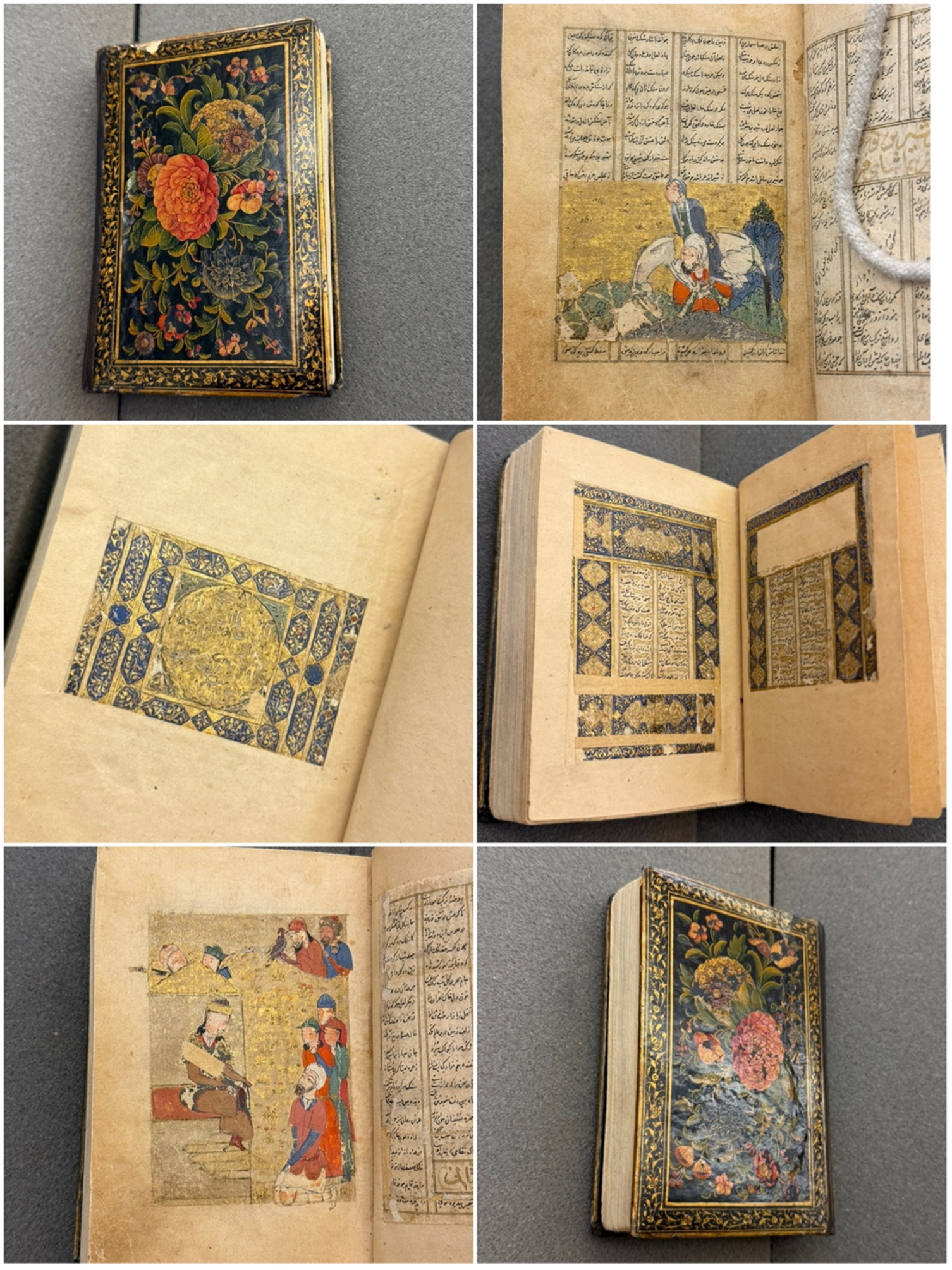 Binding: Lacquered covers with floral designs on a black ground, framed by a floral border; interior boards with brown field, black frame, and three gold-tooled inset frames; housed in a slipcase labeled “Collected poems in Persian” in gold
